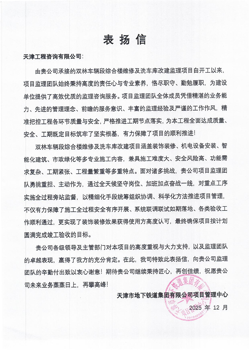 天津地鐵集團(tuán)發(fā)來(lái)表?yè)P(yáng)信,對(duì)天津咨詢雙林車輛段綜合樓維修及洗車庫(kù)改建監(jiān)理項(xiàng)目團(tuán)隊(duì)精細(xì)統(tǒng)籌協(xié)調(diào),高質(zhì)量攻克多專業(yè)施工難題給予充分肯定,認(rèn)為項(xiàng)目團(tuán)隊(duì)保障了施工安全有序和裝修呈現(xiàn)理想效果,助力項(xiàng)目圓滿完成驗(yàn)收。