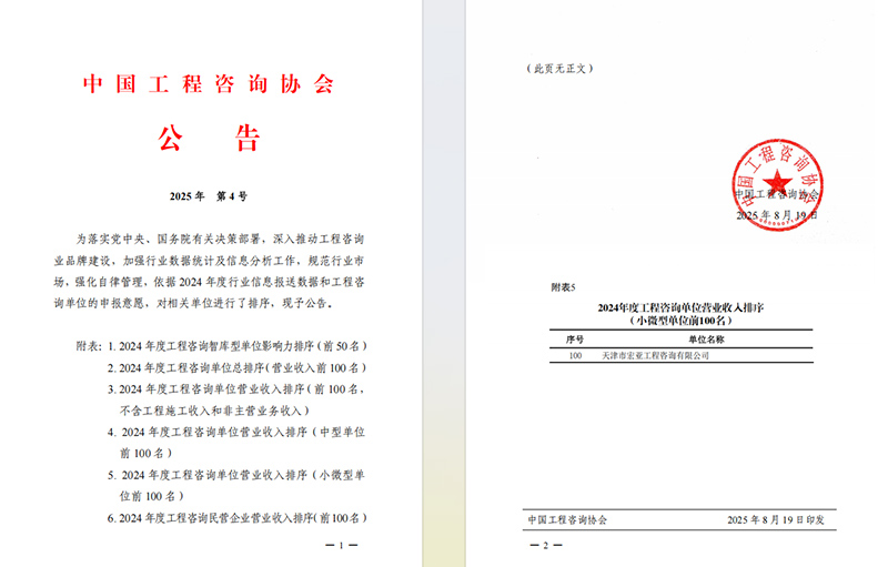 天津咨詢所屬天津市宏亞工程咨詢有限公司憑借在工程咨詢等領(lǐng)域的深耕細(xì)作和豐富積累,成功入選“2024年度工程咨詢小微型單位全國(guó)百?gòu)?qiáng)”。參與的天津市河北區(qū)中山北路城市更新項(xiàng)目獲評(píng)“2025中國(guó)城市更新優(yōu)秀項(xiàng)目”。